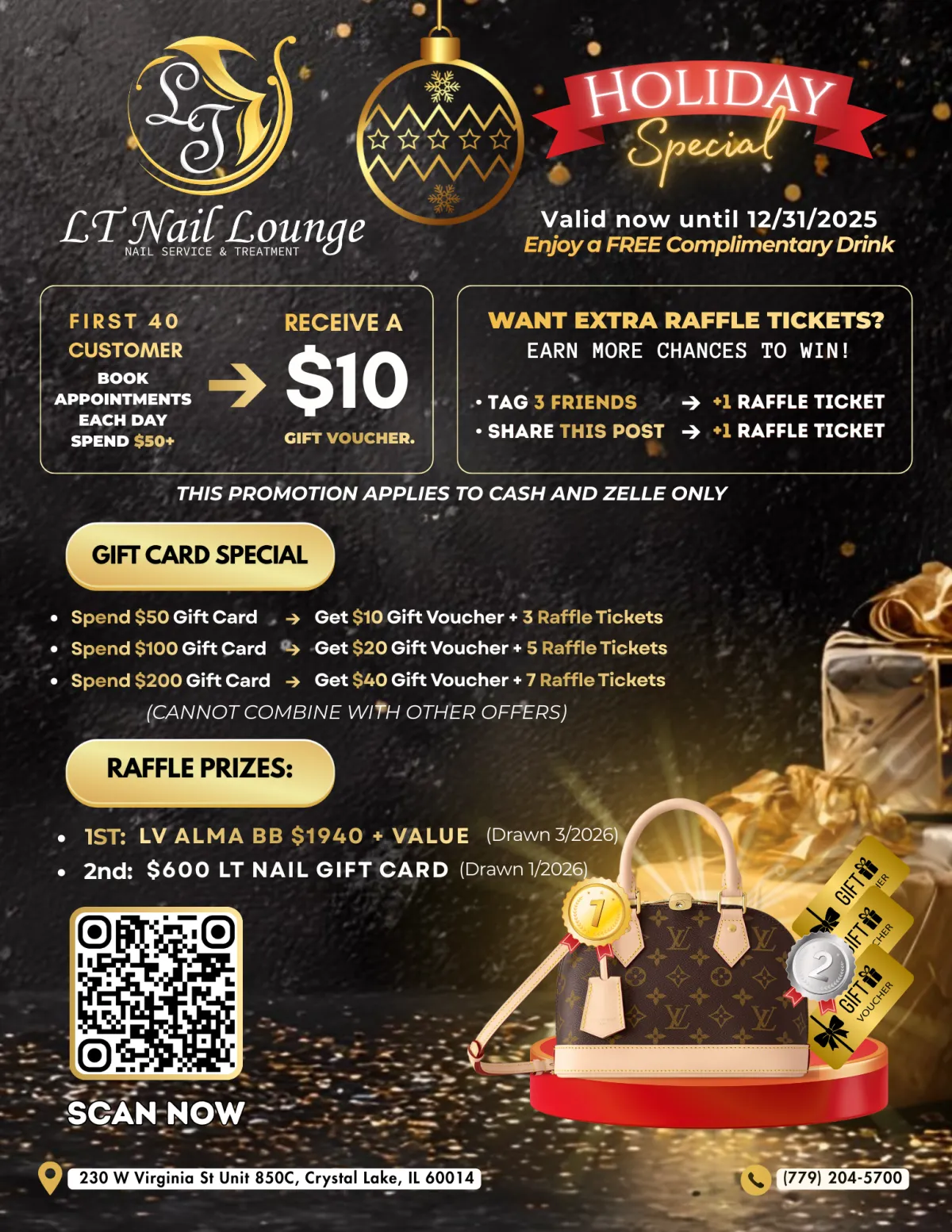 • 2nd Prize - $600 LT Nail Lounge Gift Card – Drawn January 2026